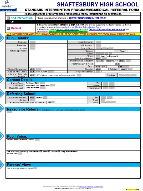 Key Stage 4 InterventionPlease click the image to download this form - complete it is full to avoid delays and return it to admissions@shaftesbury.lancs.sch.uk |