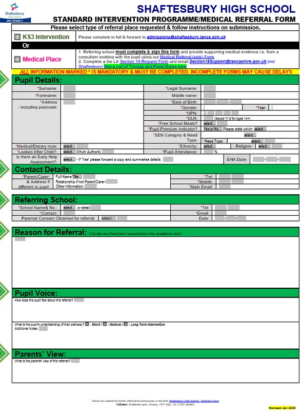 Key Stage 3 InterventionPlease click the image to download this form - complete it is full to avoid delays and return it to admissions@shaftesbury.lancs.sch.uk |